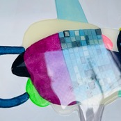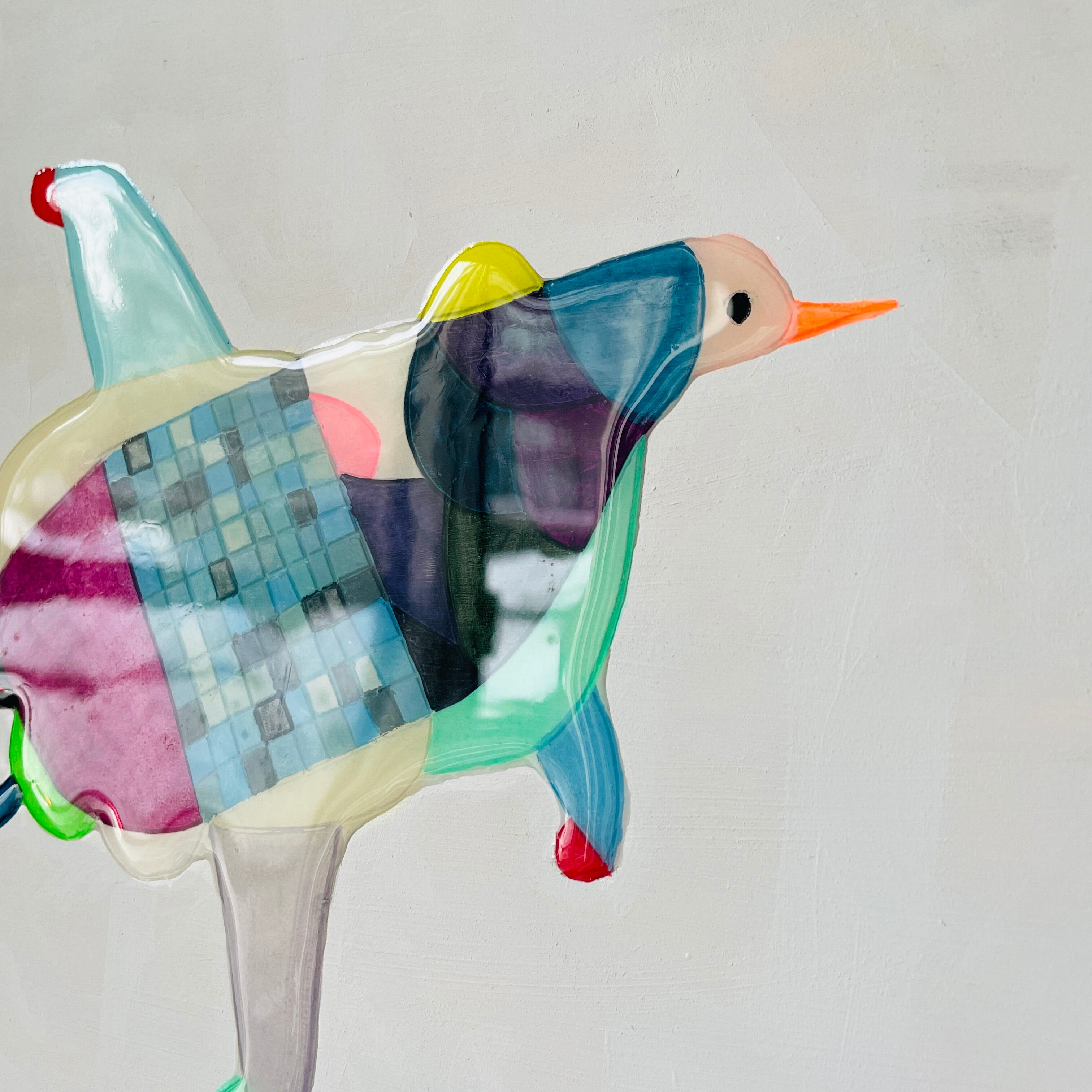 彫刻刀で下絵を彫り、アクリルで着彩後、着彩部分を樹脂加工しています。